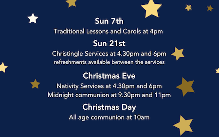 Traditional in style with hymns, readings, sermon and communion.