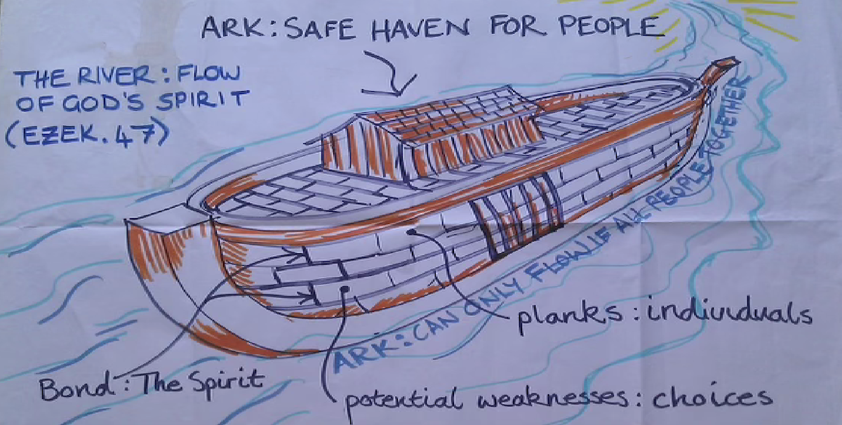 A further insight suggested that the ark was made up of planks joined together and these planks were people; individuals linked together in community, that provided the refuge. Individually, planks are buffered by the river, but together they flow as a unit and he referred to the logs that are transported down rivers in Canada.